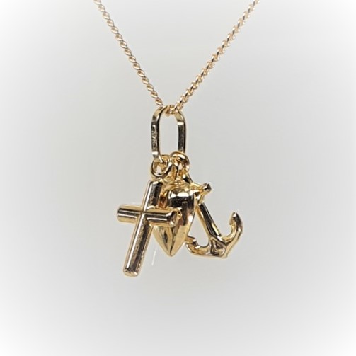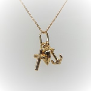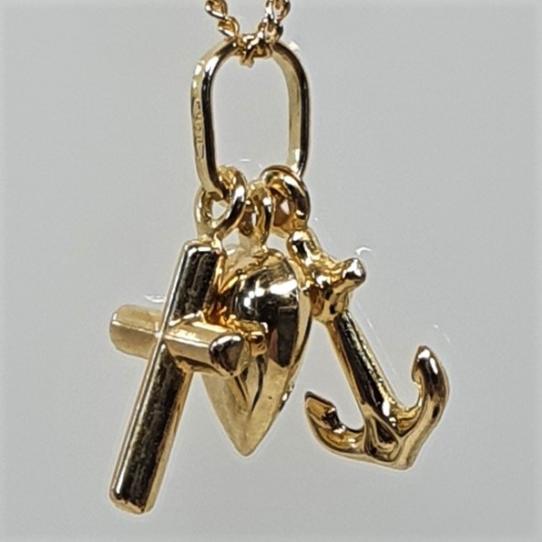 Faith, Hope and Charity, to remind us of the three great virtues that the New Testament calls for in Christians. This beautiful 9ct gold charm is made up of three separate hollow charms put onto one jump ring.