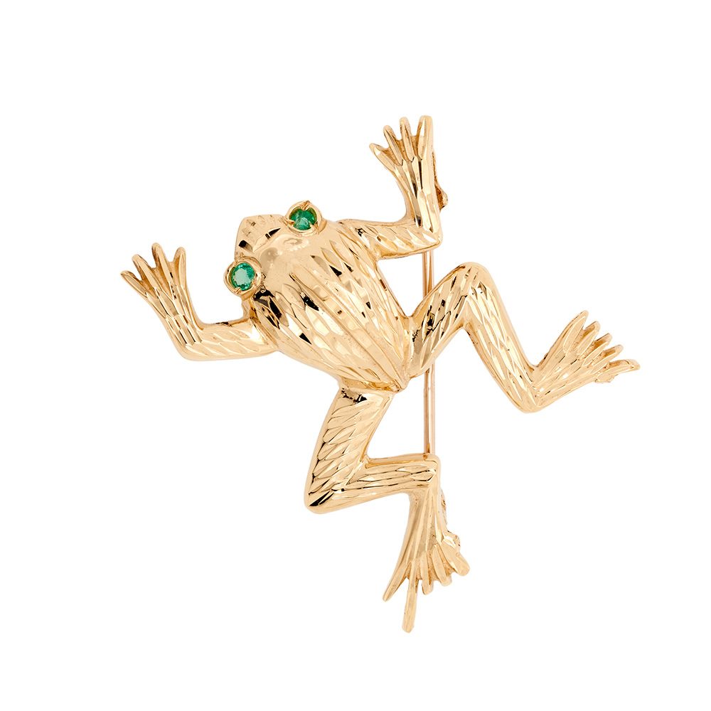 With a sparkling diamond cut pattern, this 9ct gold frog brooch showcases two petite round emeralds for the eyes.