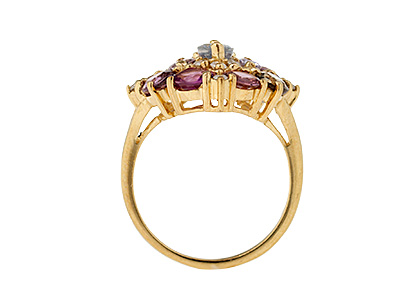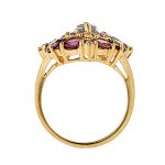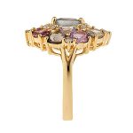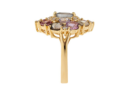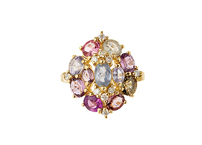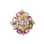 This larger-than-average, flamboyant diamond and multi-coloured sapphire dress ring is crafted in 9ct yellow gold. It is an impressive ring for the more adventurous person, a design that is sure to turn heads with admiring glances and make you stand out from the crowd.