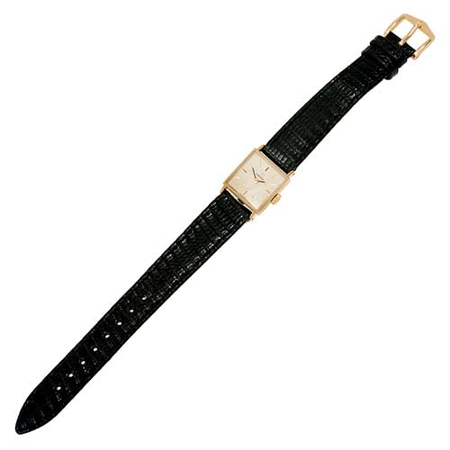 Indeed, this elegant Omega ladies’ watch in 9ct gold features a square case, black lizard strap, and serviced wind-up movement—timeless style, gift-boxed.