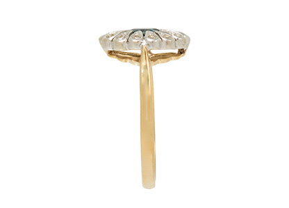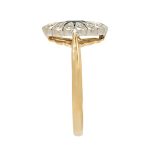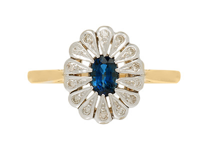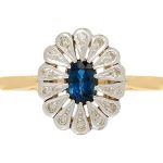 An unusual art deco style oval cluster ring, set with fourteen round white diamonds and one oval sapphire.