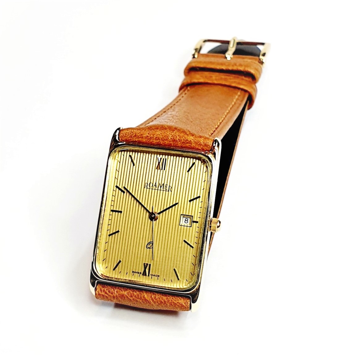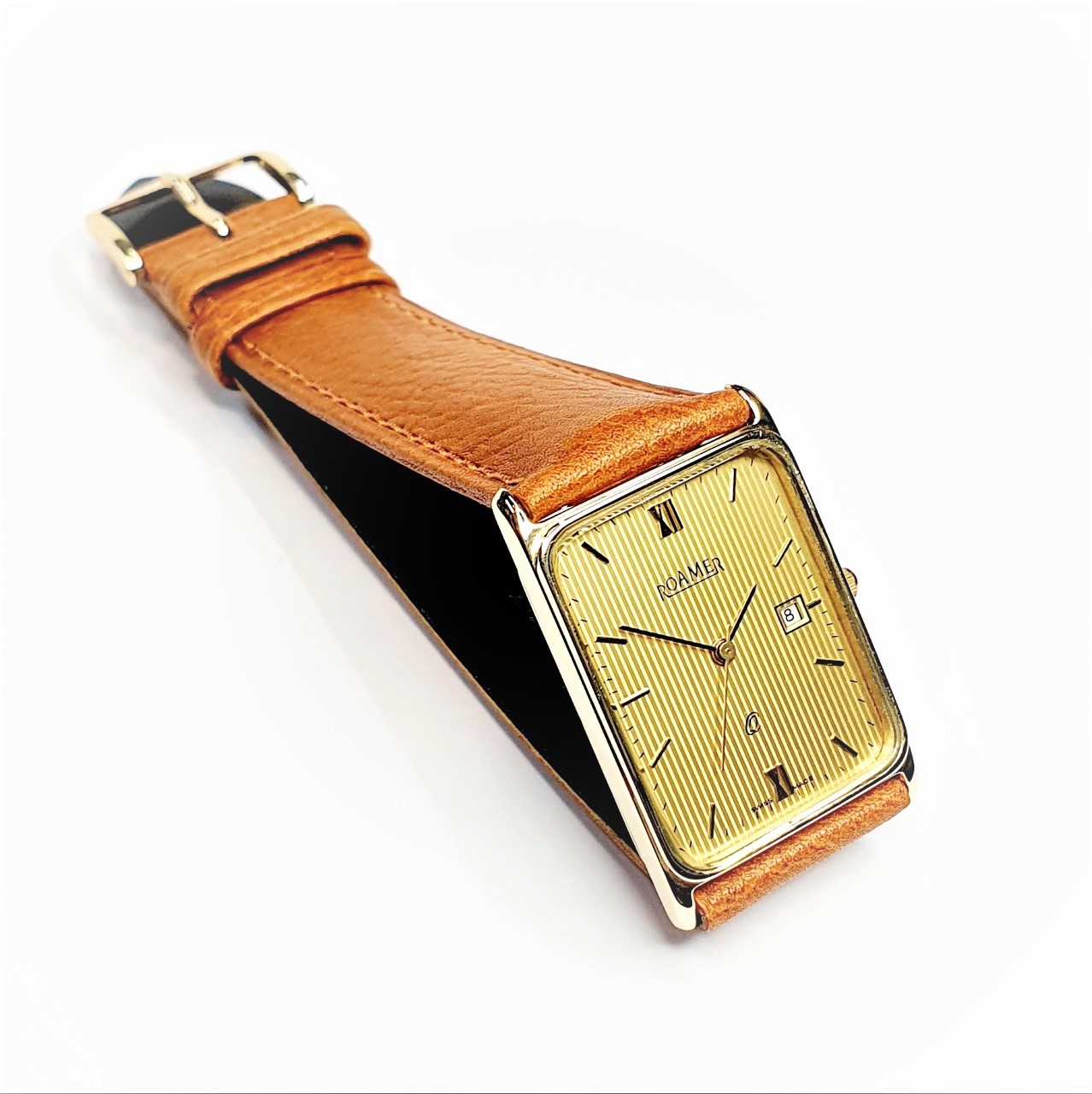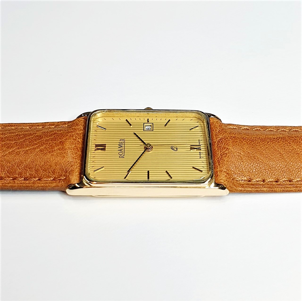 Roamer 9ct gold-cased gent’s wrist watch. With a rectangular striped champagne-coloured dial with date, gold and black coloured hands and raised hour batons, quartz movement, no need to wind, serviced in Good working order