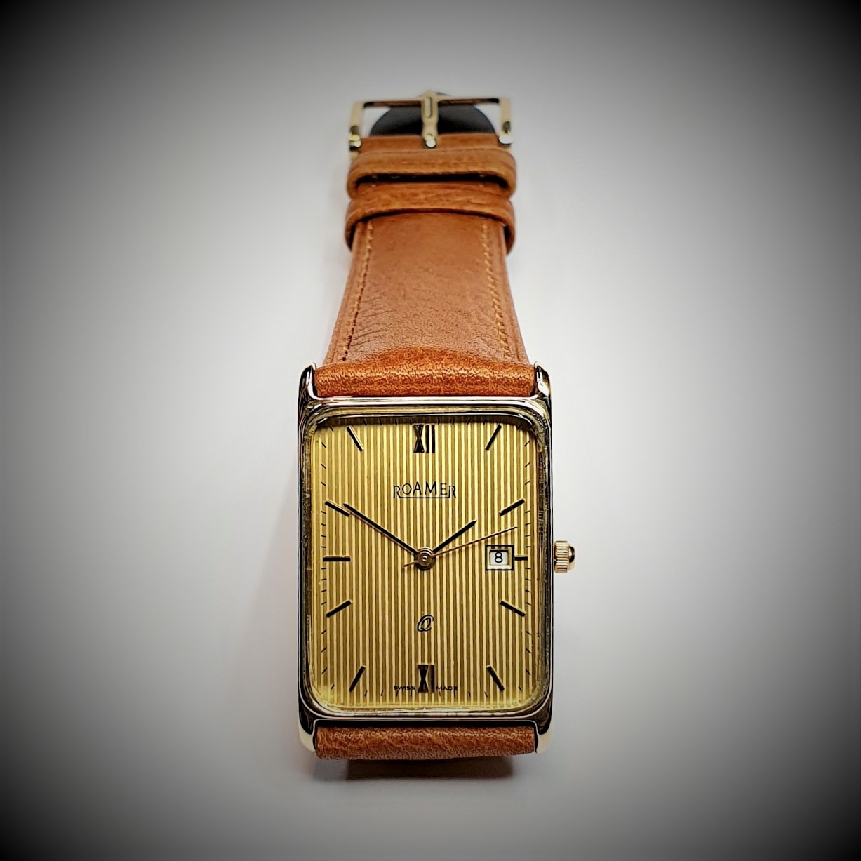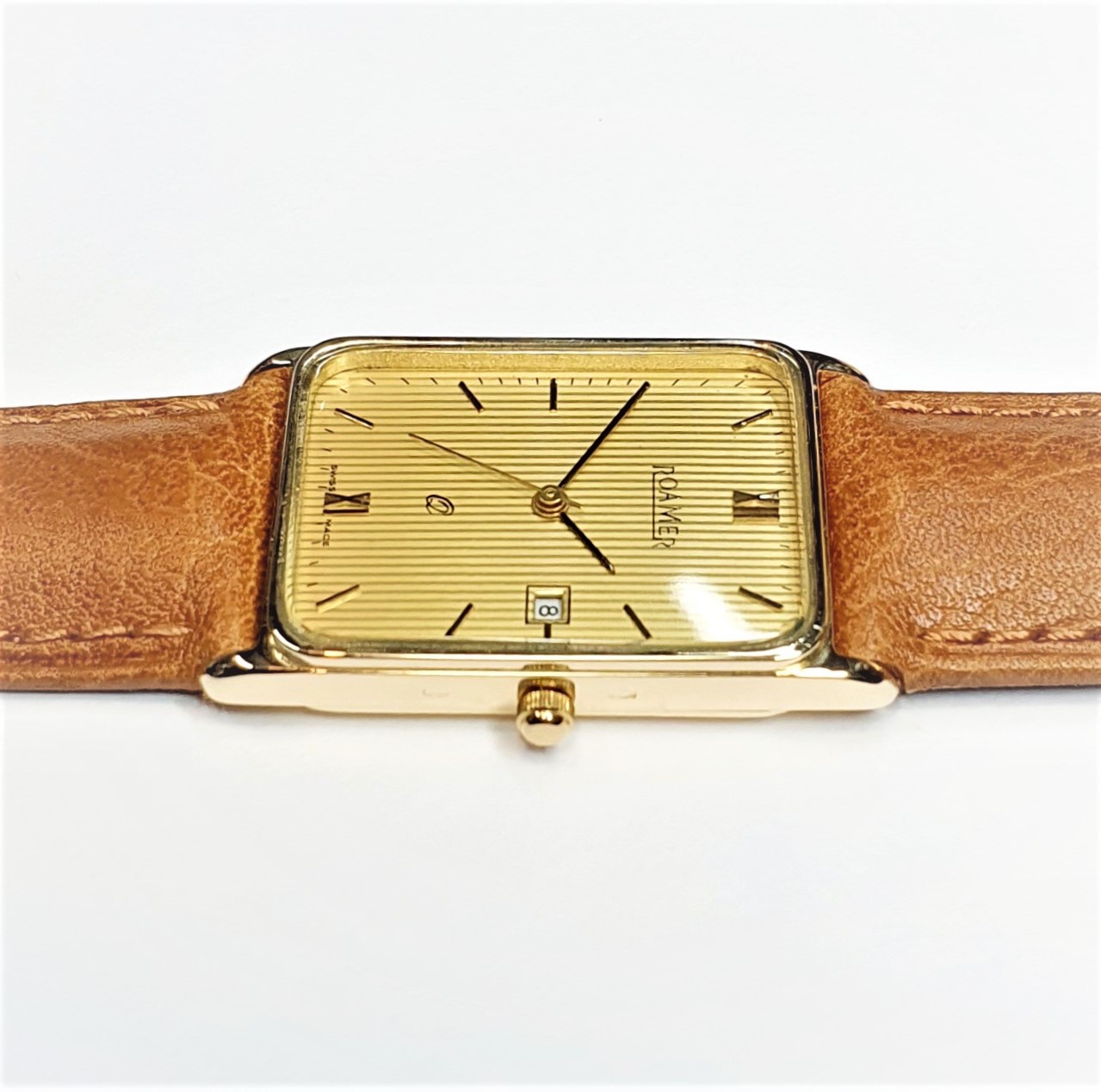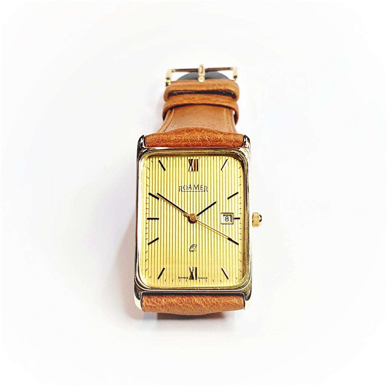 Roamer 9ct gold-cased gent’s wrist watch. With a rectangular striped champagne-coloured dial with date, gold and black coloured hands and raised hour batons, quartz movement, no need to wind, serviced in Good working order