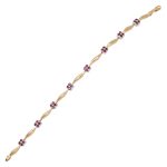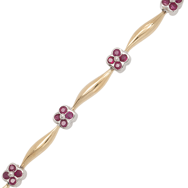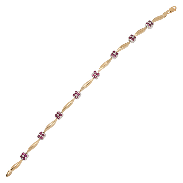 Sophisticated timeless elegance, this modern feminine bracelet is hand crafted in 9ct yellow gold with white gold settings, housing four brilliant cut blood red ruby’s to each section, creating this lovely versatile and very wearable bracelet.