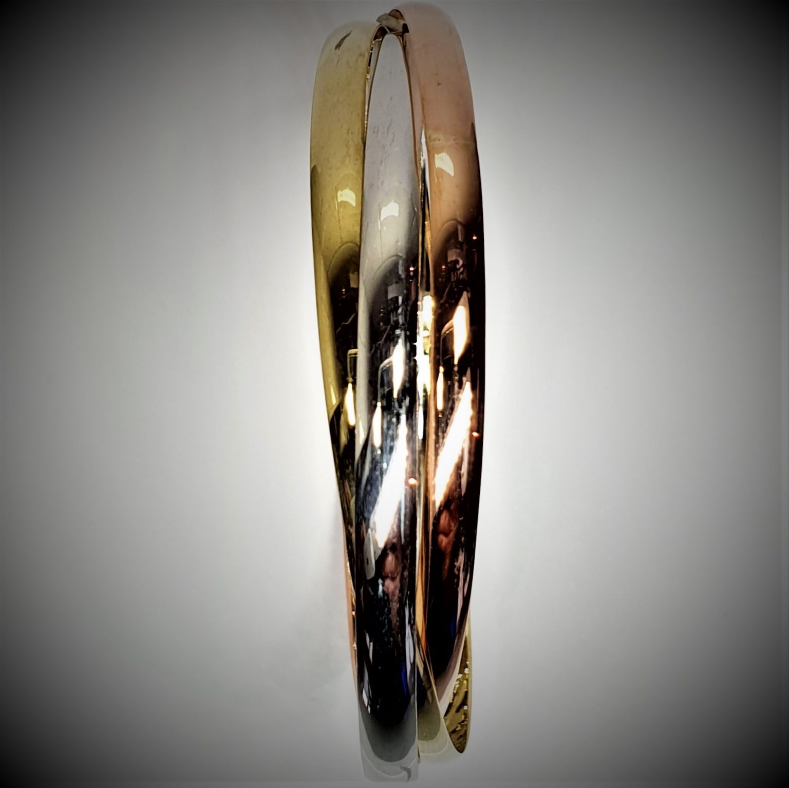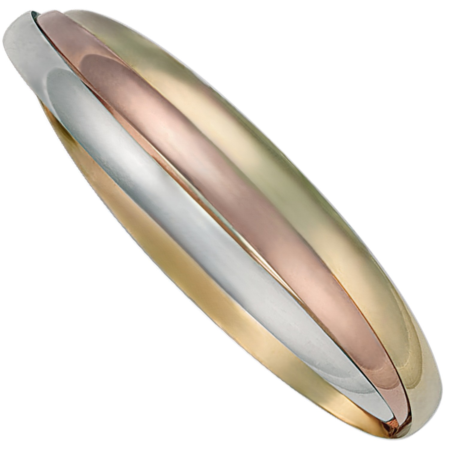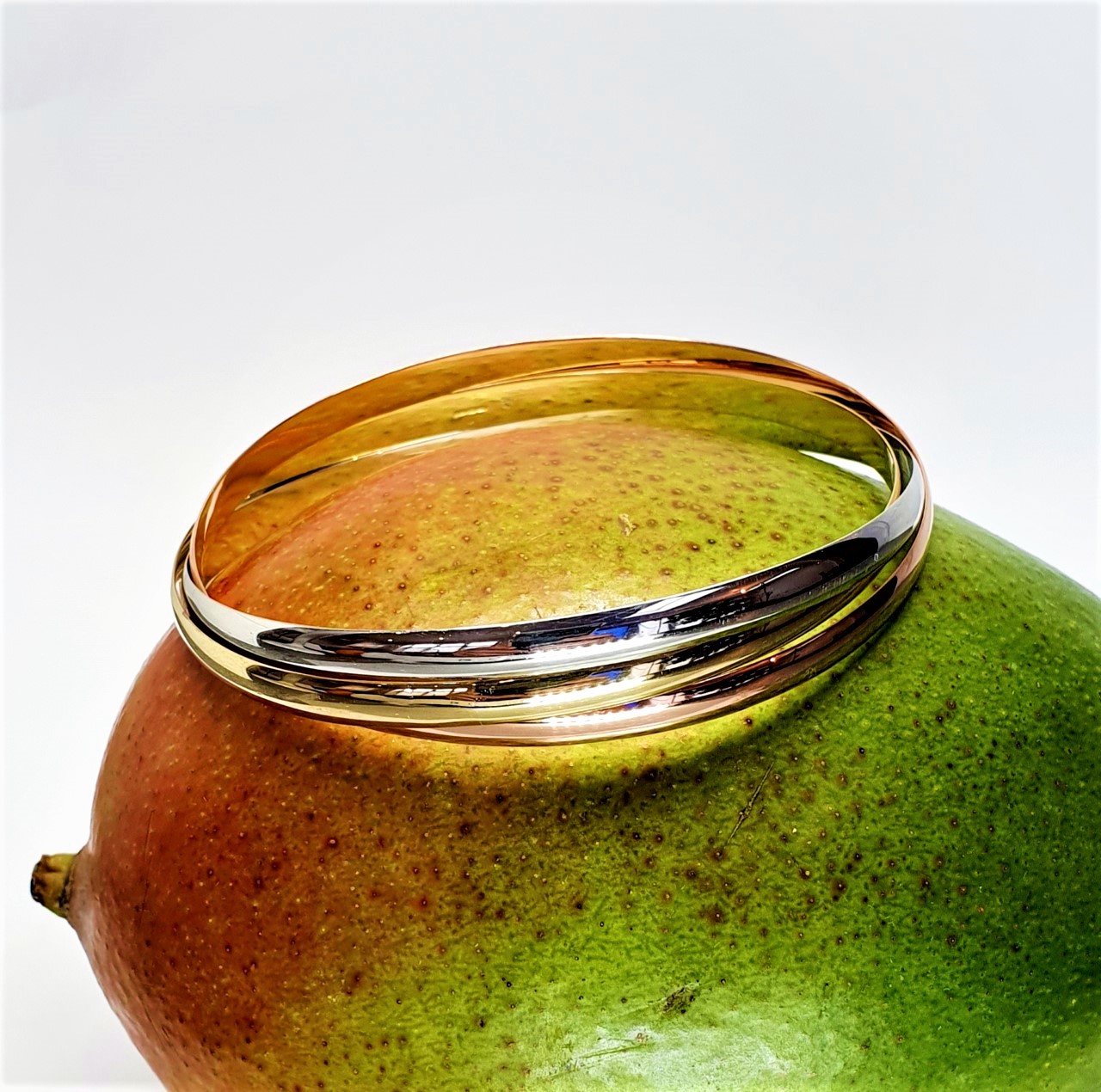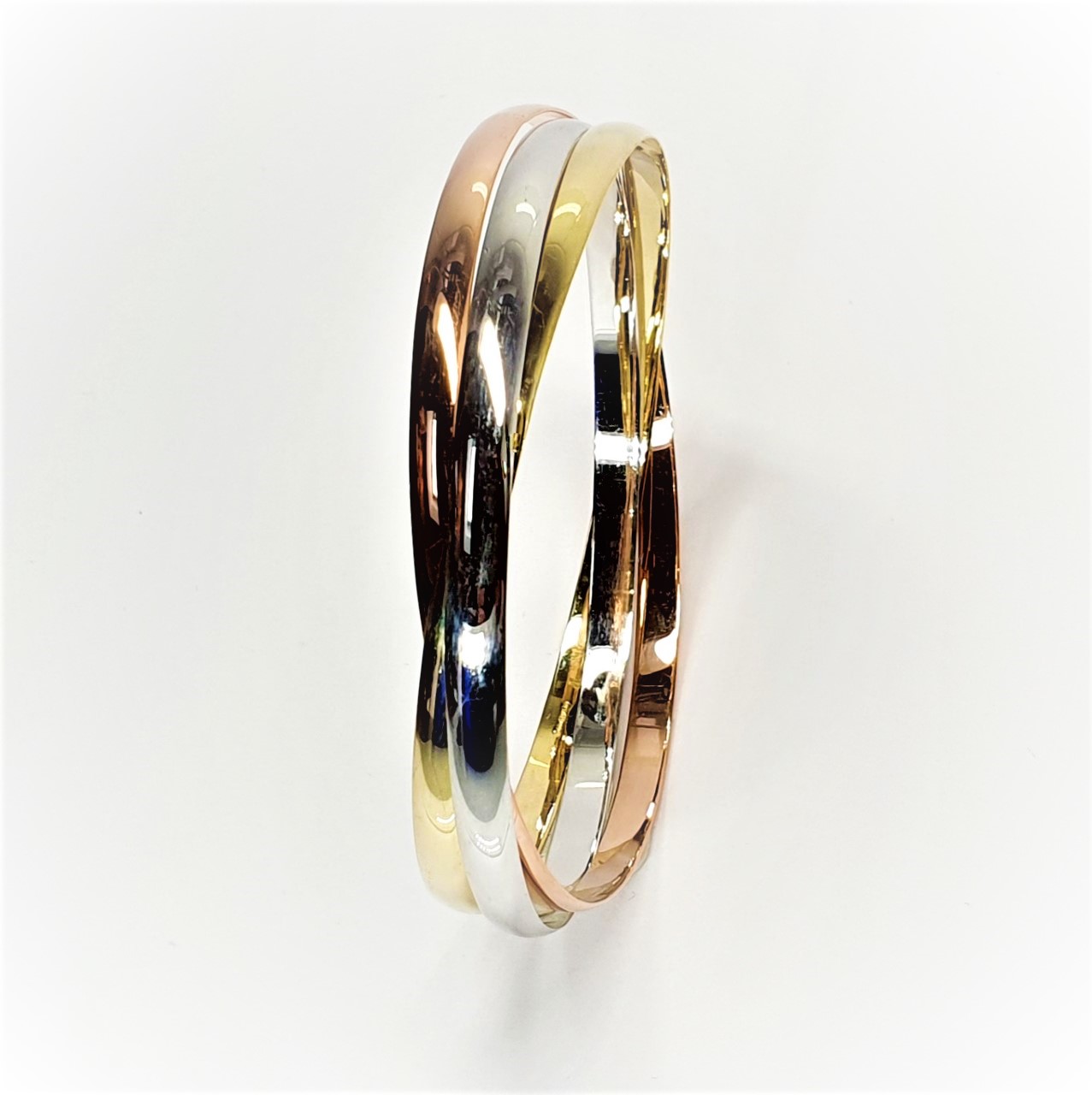 This 9ct gold bangle showcases three luxurious tones—yellow, white, and rose gold. In particular, rose gold (also known as pink or red gold) adds a romantic blush to the design. Furthermore, jewellery enthusiasts often refer to the interlocking bands as a “roll-over bangle,” reflecting its fluid and tactile appeal.