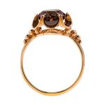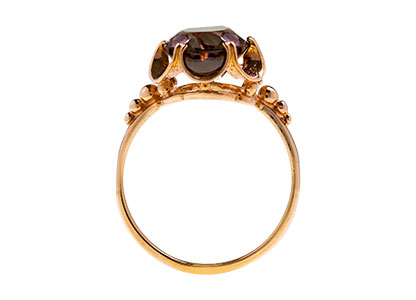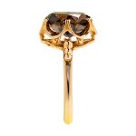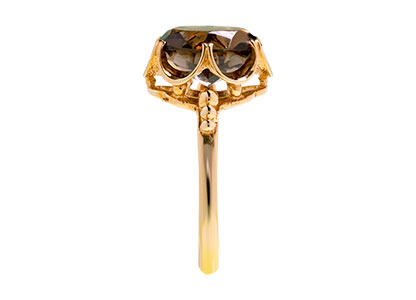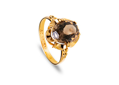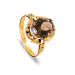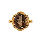 A gorgeous 9ct yellow gold ring, set with a 10mm x 8mm oval smoky quartz stone in a scalloped edge setting.