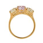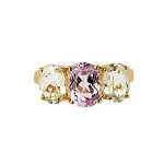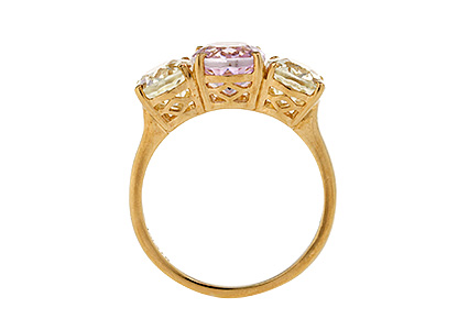 This gorgeous three stone ring is set with an oval 9mm x 7mm very light pink kunzite to the centre and an oval 8mm x 6mm very light lemon quartz to each shoulder.