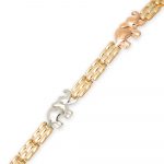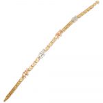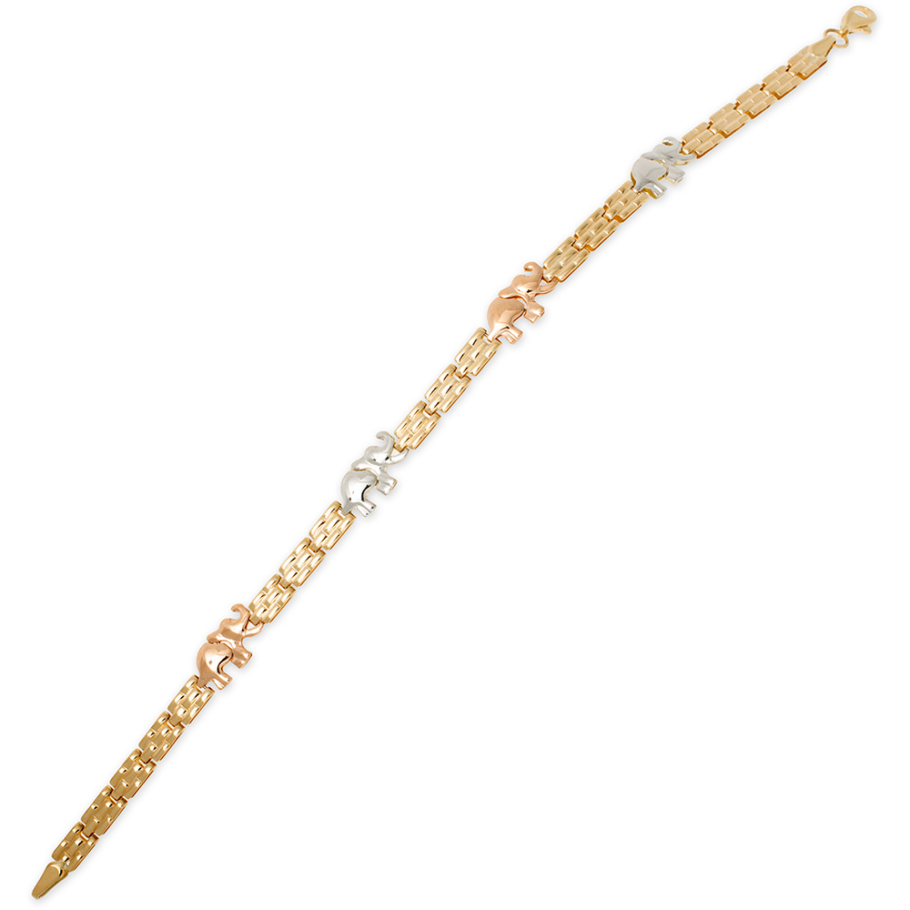 This 9ct three colour gold bracelet, has a perfect combination of classic yellow gold brick style links, with evenly spaced elephants in rose and white gold, adding an extra subtle touch of sparkle.