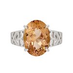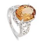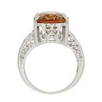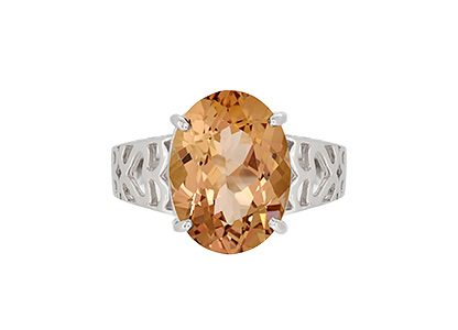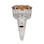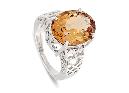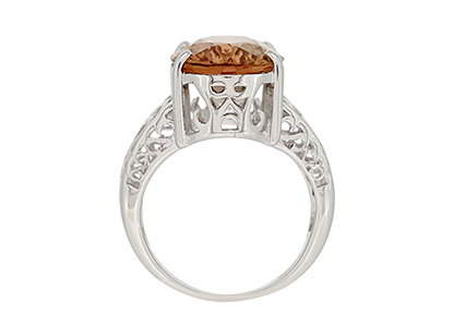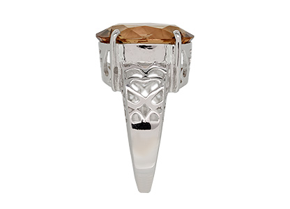 This large, vibrant, oval Smoky quartz stone, measures 16mm x 12mm and it is set into a gorgeous tapering white gold band, pierced out with a lovely scroll and heart pattern to both side shoulders.