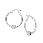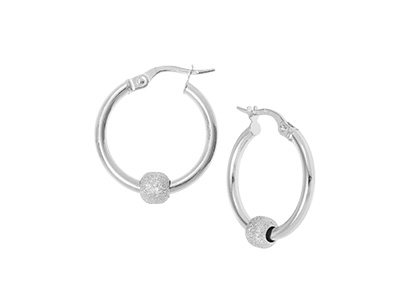 These contemporary 9 carat white gold round hoop earrings, are beautifully made of polished round tubes threaded with a single frosted ball, to create a timeless classic that will never date.