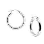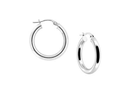 These contemporary 9 carat white gold round hoop earrings are beautifully made of polished round tubes with a hinged clip down ear wire. A timeless classic that will never date.
