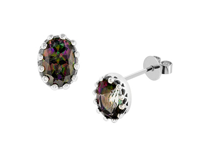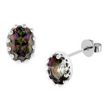 A beautiful eye catching design that is sure to attract admiring glances. These beautiful mystic topaz are mounted in a 9ct white gold royal crown setting which has twelve claws on each earring, giving an ornate style that compliments the vibrant rich colours of the mystic topaz.