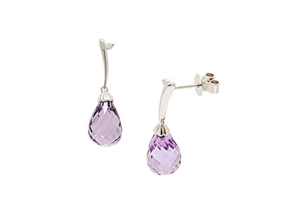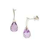 Simply outstanding, these beautiful 9ct white gold drop earrings have a plain tapered bar, offset with a single petite round white diamond. Suspended from the end of each earring is a sparkling deep purple amethyst teardrop briolette cut stone, which creates a colourful dazzling display of sparkling fire as you move.