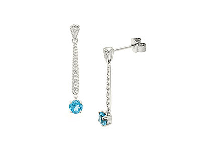 This beautiful pair of 9ct white gold drop earrings are made in two moving sections, featuring a triangular fan shape top set with a single round diamond and connected to a slim suspended tapered bar set with a further three diamonds, all with a mill grain setting edge giving a gorgeous antique look. Attached at the base is a beautiful round sky blue topaz stone.