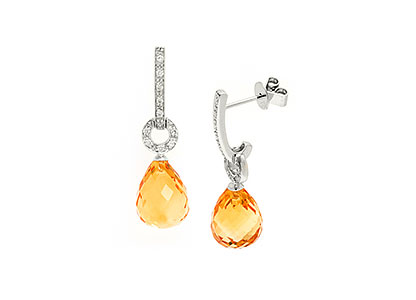 Simply stunning, these beautiful 9ct white gold diamond drop earrings are encrusted with eleven round brilliant cut white diamonds and a sparkling golden yellow teardrop briolette cut citrine in each earring.
