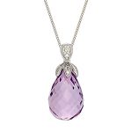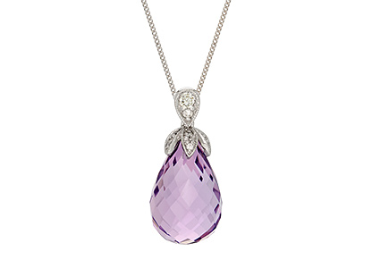 This Mesmerizing majestic pendant is unique to city of London jewellers, designed in our Eldon street studio, crafted in 9ct white gold with a large 15mm x 10mm gorgeous sparkling purple teardrop briolette cut amethyst, enhanced with round white diamonds to the leaf style top and the chain bail.
