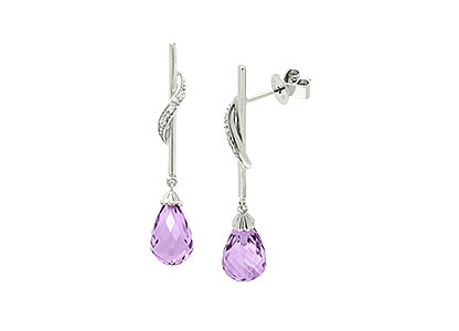 These drop earrings feature a gorgeous rich purple teardrop briolette cut amethyst, suspended from a sleek polished bar of 9ct white gold attached with a marquise shape swirl, set with three round brilliant cut white diamonds adding a subtle sparkling touch.