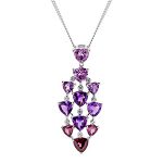 An Intriguing cascade of beautiful trillion cut purple amethyst & rich red Mozambique garnets, all brought together into a 9ct white gold marquise shape pendant interlaced with petite round white diamonds. This necklace will add a touch of colourful glamour to your look and make you feel great every time you wear it.