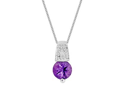 Featuring an exquisite round 5mm brilliant cut amethyst enhanced with an elusion set sparkling round diamond to the saddle loop.