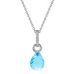 Simply stunning, this beautiful 9ct white gold diamond drop pendant is encrusted with eleven round brilliant cut white diamonds and a sparkling cool blue teardrop briolette cut blue topaz.