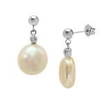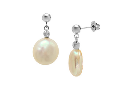 Make a glamorous impact on special occasions, with these stunning pearl and diamond drop earrings , crafted in 9ct white gold and featuring an unusual luxurious coin shaped cultured pearl set with a single brilliant cut white diamond to the top.