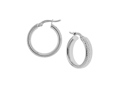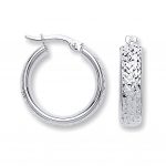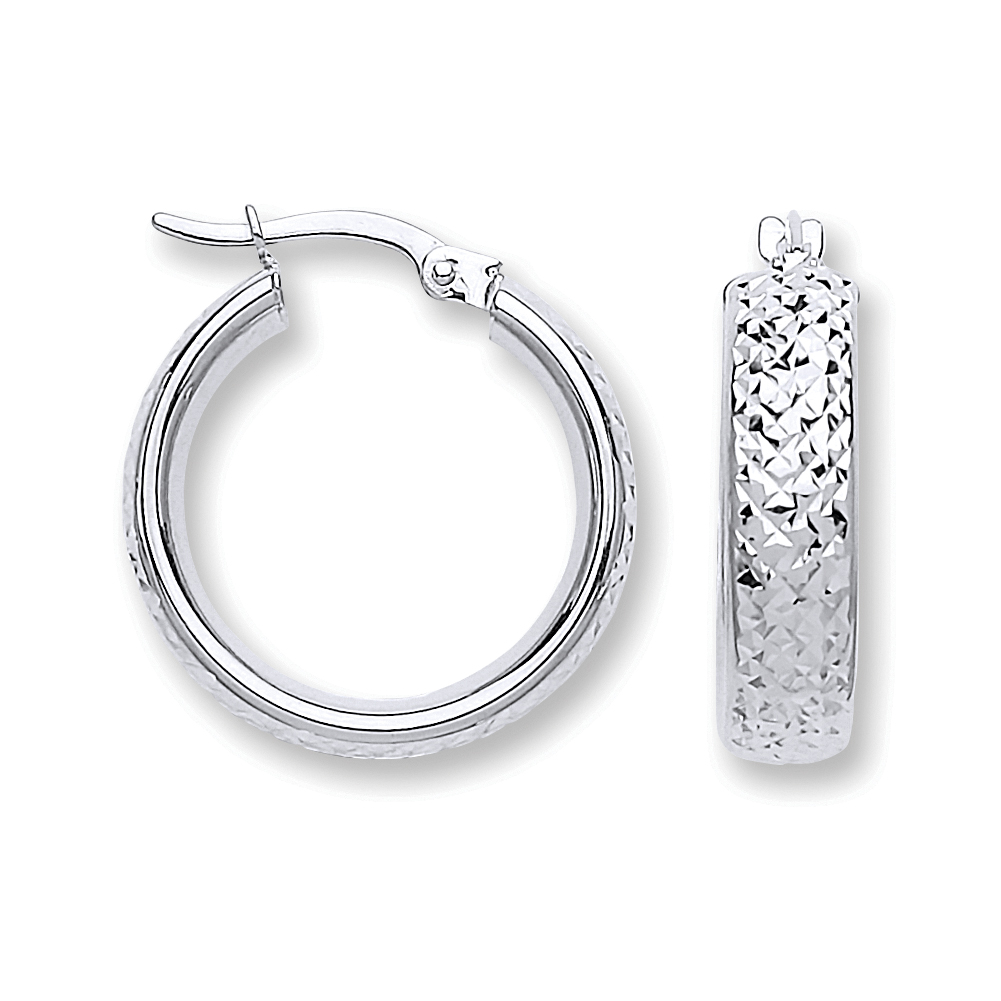 These vibrant, sparkling, 9ct white gold loop earrings, have a beautiful crisscross diamond cut pattern, which catches and reflect light in every direction to create a dazzling display of sparkling fire as you move.