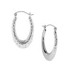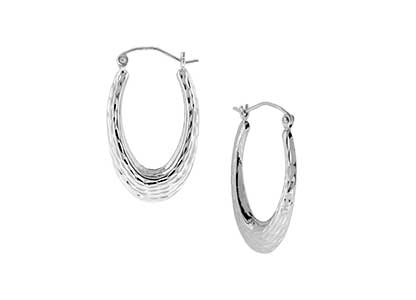 These vibrant, sparkling, 9ct white gold oval creole loop earrings, have a beautiful tree barked style diamond cut pattern, which catches and reflect light in every direction to create a dazzling display of sparkle as you move.
