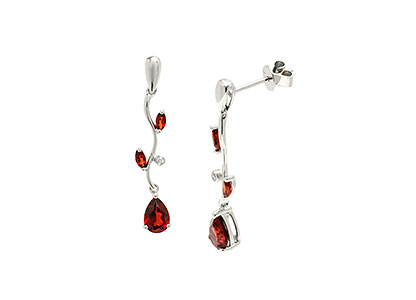 Make a bold statement with these gorgeous 9ct white gold drop earrings, drawing inspiration from shapes of nature. This unusual branch leaf and flower design evokes a satisfyingly delicate and famine feature with shimmering tranquil colours set with a single round white diamond, a beautiful single pear shape and two marquise shaped beautiful red Mozambique garnets in each earring.