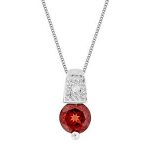 Featuring an exquisite round 5mm brilliant cut mozambique garnet enhanced with an elusion set sparkling round diamond to the saddle loop.