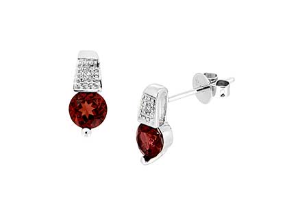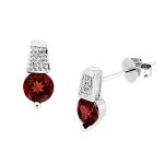 Featuring two exquisite round 5mm brilliant cut Mozambique garnets, enhanced with an elusion set sparkling round diamond to the top.