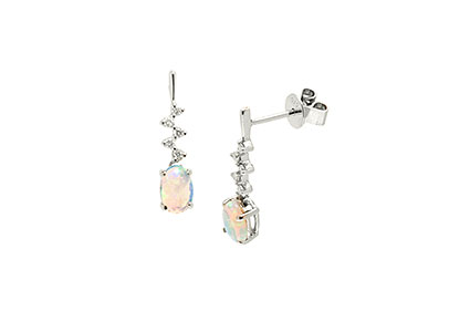 Claw set with five beautiful round sparkling brilliant cut diamonds into a zigzag pattern, leading to a stunning oval white and multi coloured opal in each earring.