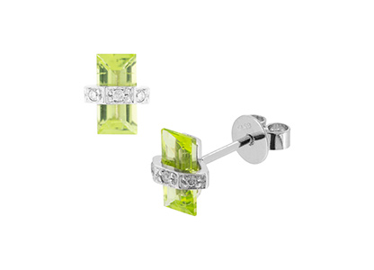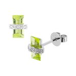 Simply beautiful, these rectangular baguette shaped olive green peridot and diamond stud earrings, create a look that is elegant and graceful. Each stone is wrapped with a single band of white gold set with sparkling white diamonds, giving a dainty feminine look.