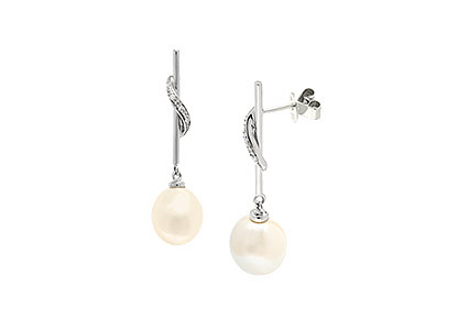 These drop earrings feature a gorgeous snowy white cultured pearl, suspended from a sleek polished bar of 9ct white gold attached with a marquise shape swirl, set with three Round brilliant cut white diamonds adding a subtle sparkling touch.