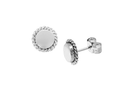 9ct White gold flat disc stud earrings with a highly polished top and a stylish rope twist design around the edge.
