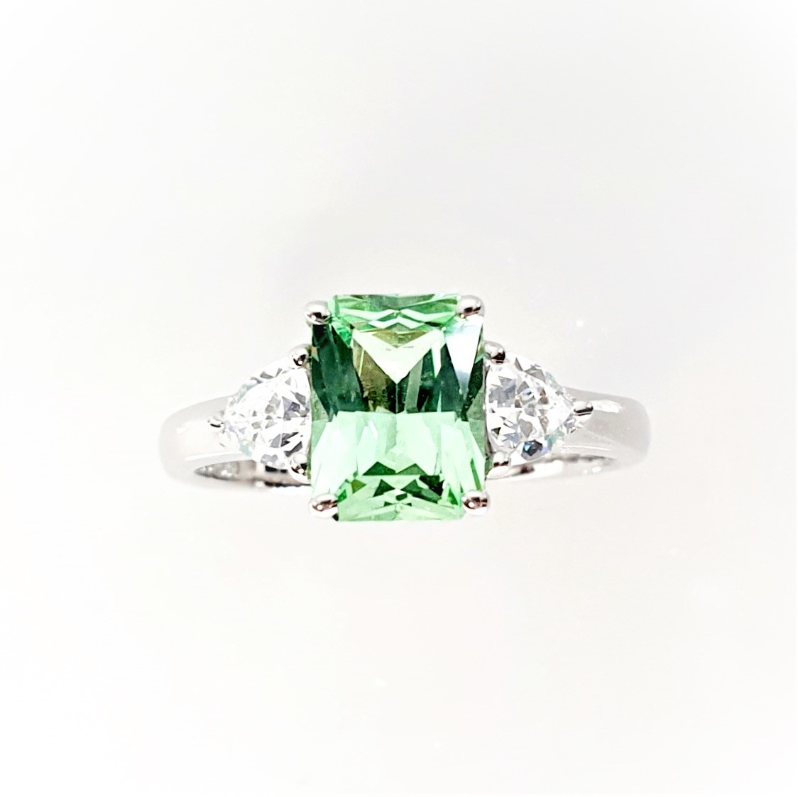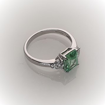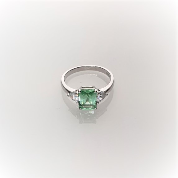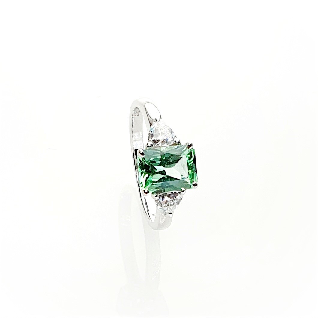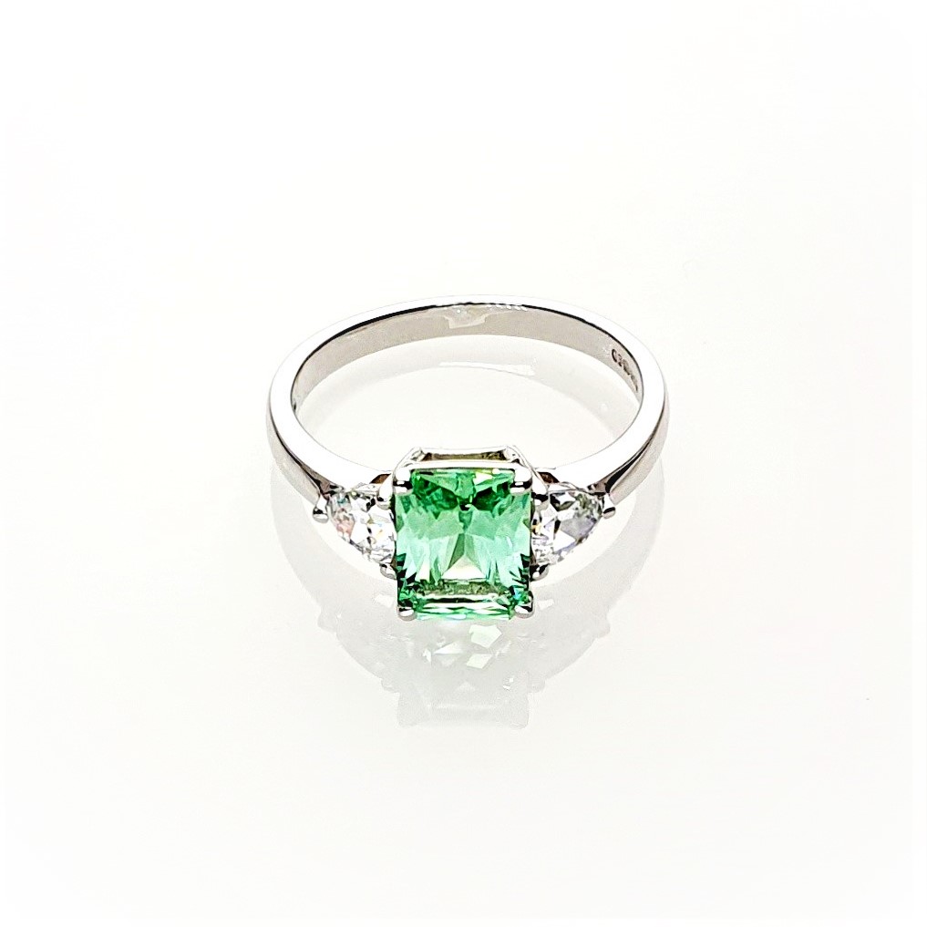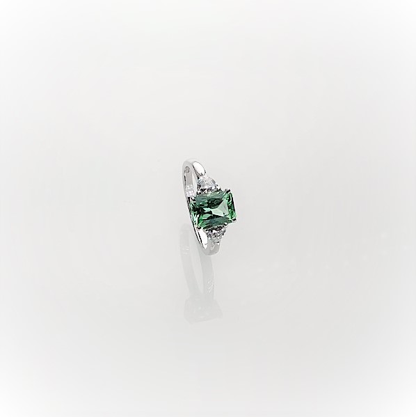 This gorgeous sparkling emerald cut green cubic zirconia measures 8mm x 6mm and also has a contrasting white trillion cut cubic zirconia on each shoulder for extra sparkle. Crafted in 9ct white gold a beautiful eye catching ring that will inspire adoration from young and old alike. So why not surprise the lady you love with this lovely feminine ring and set her heart on fire.