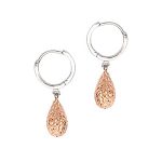 These contemporary 9ct white gold highly polished round huggy hoop earrings, have a vibrant sparkling 9ct rose gold pear shaped bead hanging from the centre with a crazy diamond cut pattern, so called because the pattern is cut at every possible angle, making sure to catch and reflect light in every direction to create a dazzling display of sparkling light as you move, adding a stylish finishing touch to any outfit.