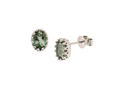 A beautiful eye catching design that is sure to get admiring glances. These beautiful green topaz earrings are mounted in a 9ct white gold royal crown setting, which has twelve claws on each earring giving an ornate style that compliments the vibrant green of the topaz. Inspired by the designs of the Victorian era these earrings will make a great feature to your jewellery collection.