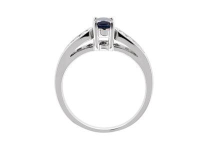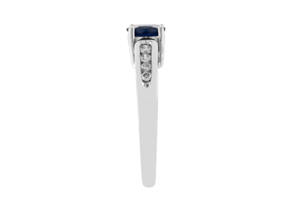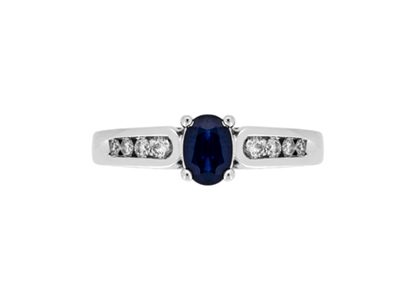 A lovely, oval dark blue sapphire with four graduated round diamonds, in a channel setting to each shoulder. A great gift for any occasion, also ideal for an engagement ring.