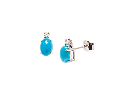 Simply stunning, these luxurious 9ct white gold stud earrings are elegant and intricately crafted to the highest standard. Claw set with a beautiful oval cabochon cut cool sky blue turquoise, that contrasts perfectly with the single round brilliant cut white sparkling diamond, which is set to the top.