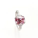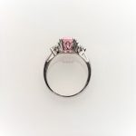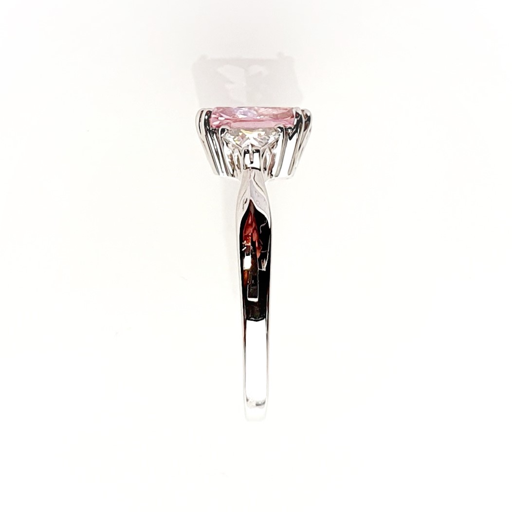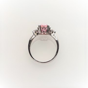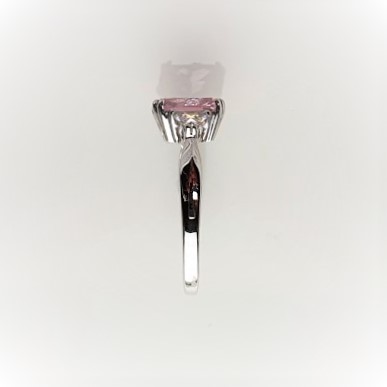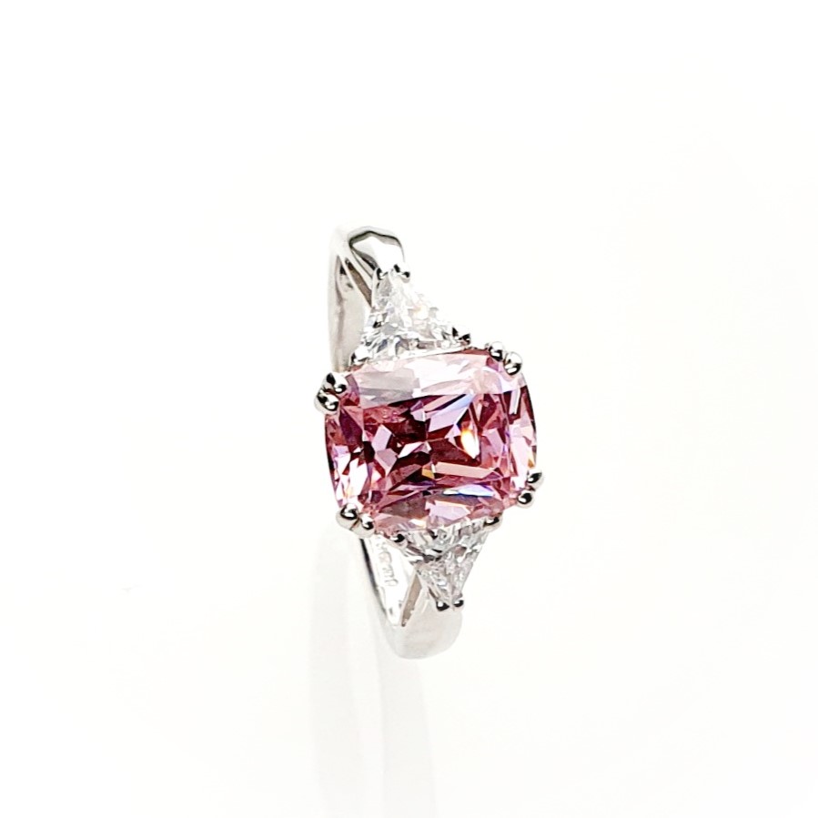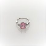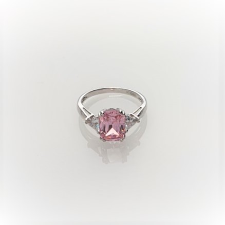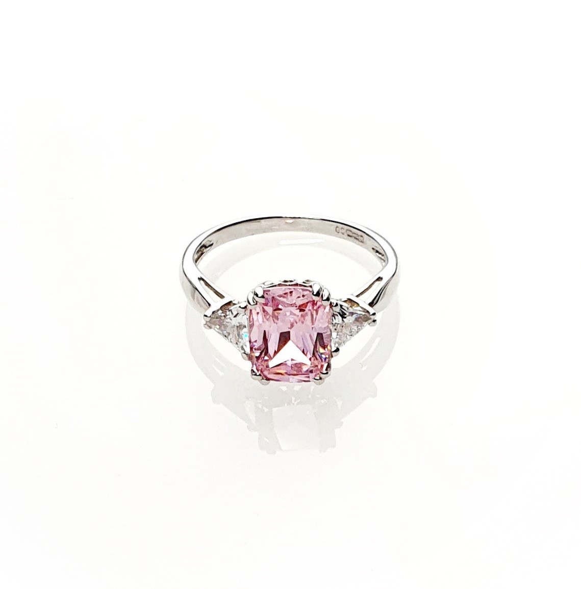 This gorgeous sparkling emerald cut pink cubic zirconia measures 9mm x 7mm and also has a contrasting white triangular cut cubic zirconia on each shoulder for extra sparkle. Crafted in 9ct white gold a beautiful eye catching ring that will inspire adoration from young and old alike. So why not surprise the lady you love with this lovely feminine ring and set her heart on fire.