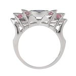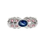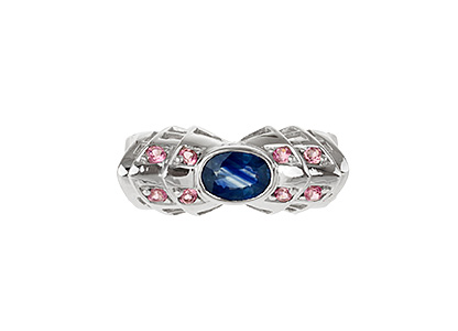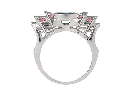 This genuinely stunning, creative design will capture admiring glances and add a stylish finishing touch to your outfit. It has a single oval blue sapphire in the centre and four round pink stones on each shoulder.