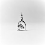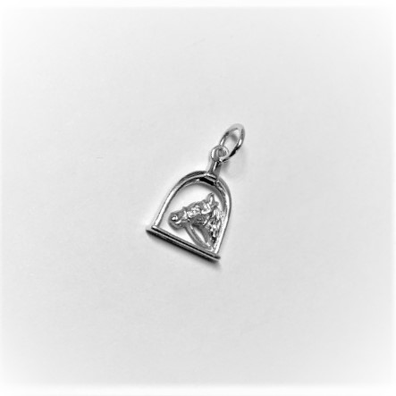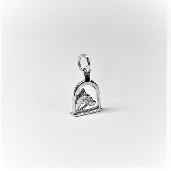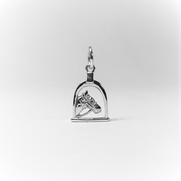 The equestrian pendant charm, consisting of a horses head shown through a stirrup in 3D showing on both sides.
