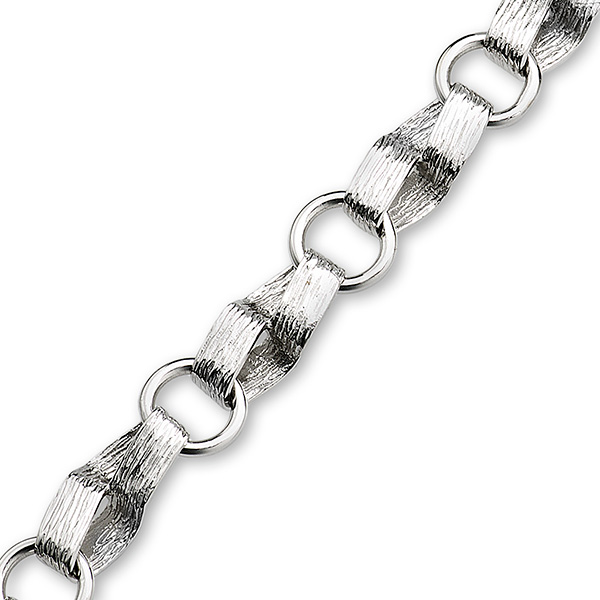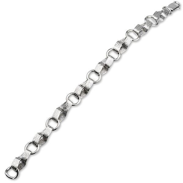 This beautifulĀ robust 9ct white gold bracelet with eight solid ribbon style links, is hand finished with a tree bark pattern and brought together with contrasting plain solid links.