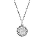 This lovely 9ct white gold round Saint Christopher pendant has the words ‘SAINT CHRISTOPHER PROTECT US’ clearly embossed around the polished border, the centre has a Matt finish and the back is also polished to allow for engraving if required.