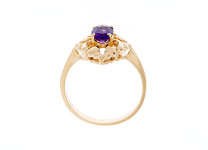 This gorgeous, elaborately styled dress ring, has a tantalising glamorous look with sleek, creative curves and smooth contours. Crafted in 9ct yellow gold and set with a single oval brilliant cut rich purple amethyst that will add a touch of colour to your outfit and look great for both day or evening wear.
