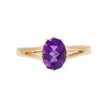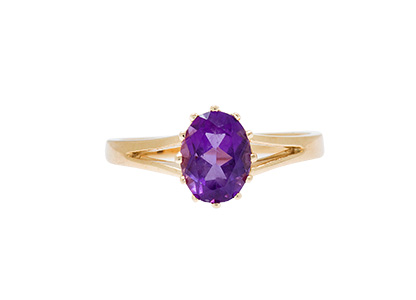 This beautiful classic dress ring, is crafted in 9ct yellow gold and set with a single oval brilliant cut, rich regal purple amethyst, with a timeless appeal, Perfect for adding a luxurious splash of colour to your outfit that is sure to be adored.