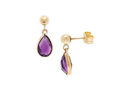 These beautiful rich purple teardrop amethyst are multi facetted on both sides and surrounded with a channelled strip of 9ct yellow gold, suspended from a 4mm 9ct gold ball ear fitting. A creative style perfect for every day wear.