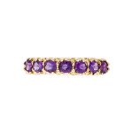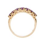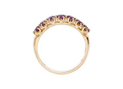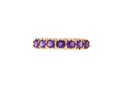 A timeless and elegant design, set with seven round brilliant cut purple amethysts, crafted in to a beautiful 9ct yellow gold gallery claw setting for that extra touch of luxury. A gorgeous ring you’ll treasure forever that will make every occasion special.