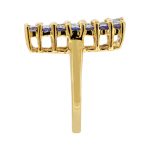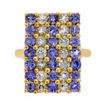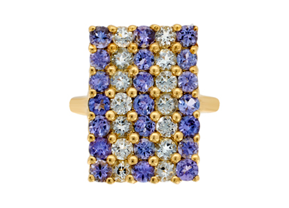 This lovely ring is made in 9ct yellow gold and encrusted with twenty-one 2.5mm round light violet-blue tanzanites and fourteen 2.5mm very light aquamarines. It has been re-polished and is in excellent condition.