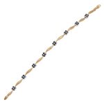 Sophisticated timeless elegance, this modern feminine bracelet is hand crafted in 9ct yellow gold with white gold settings, housing four brilliant cut dark blue sapphires to each section, creating this lovely versatile and very wearable bracelet.